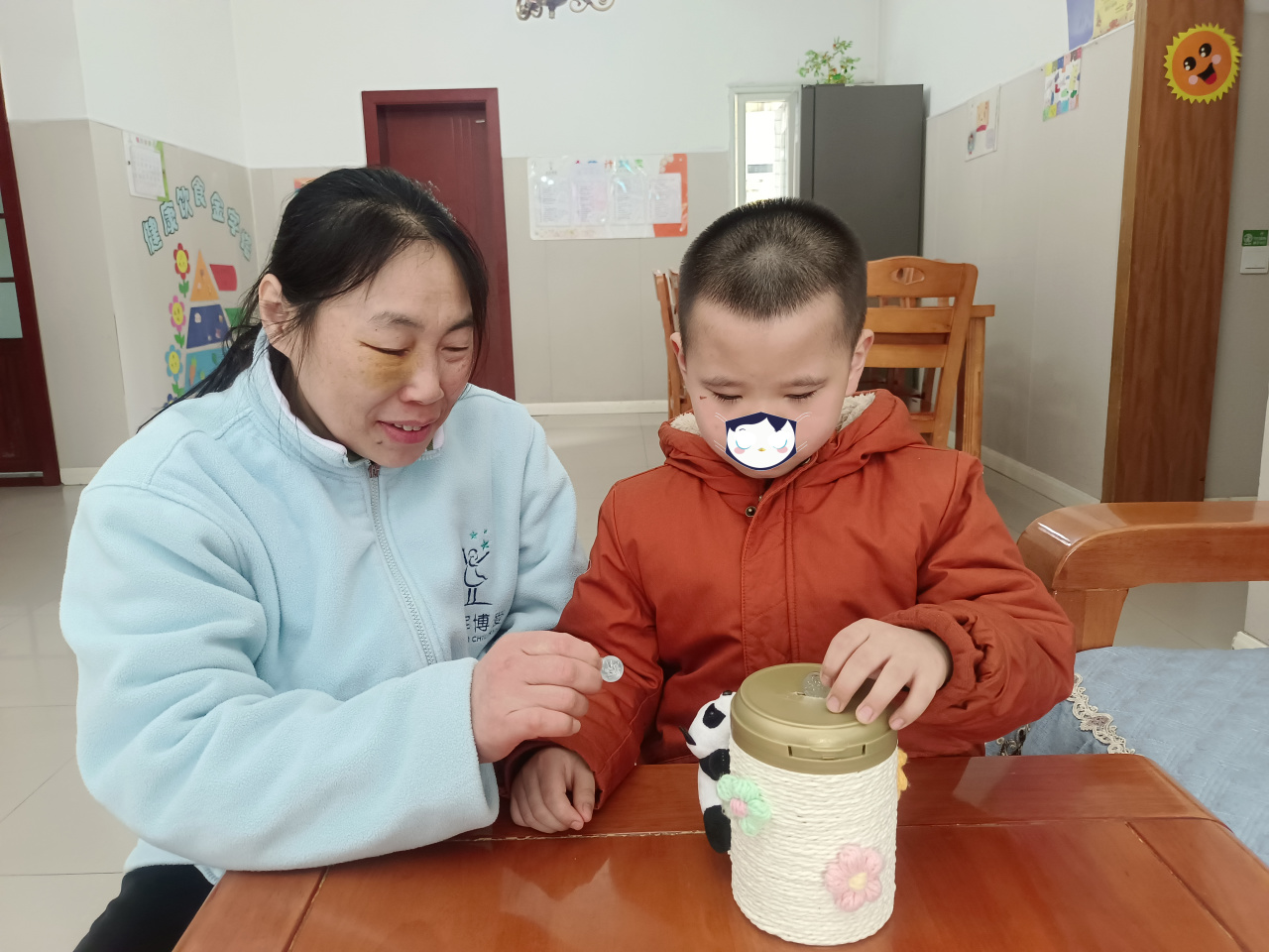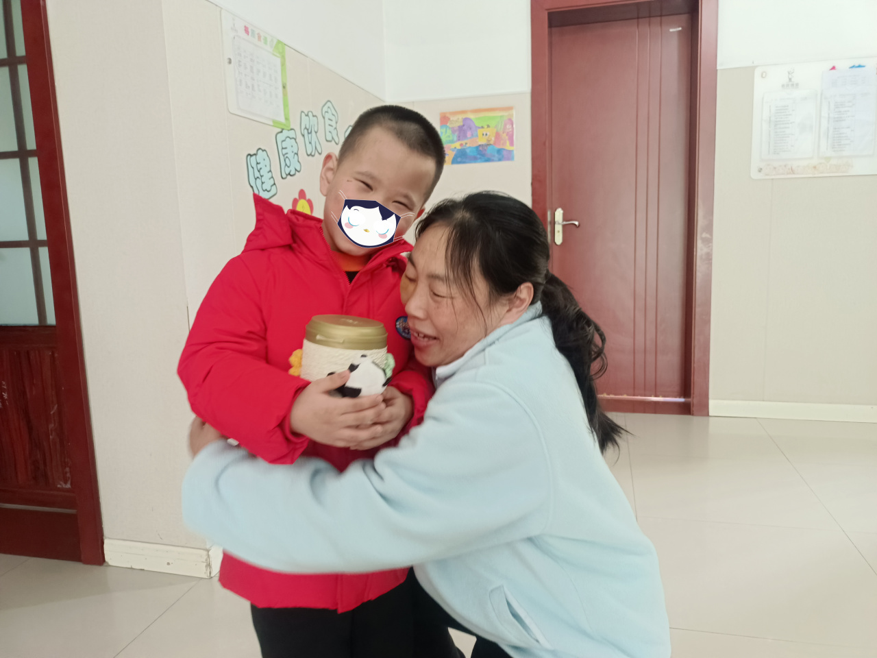 After the show, the elderly residents presented gifts to the children. Though modest in value, each gift was handmade and filled with warmth. One elderly lady slowly walked up to Han, her kind eyes full of affection. She gently handed him a piggy bank made from an empty formula can. The can was beautifully decorated: white twine wrapped in perfect circles around the outside like a delicate coat, adorned with colorful flower petals, and a fuzzy bear sticker clung tightly to its side, as if protecting something precious.